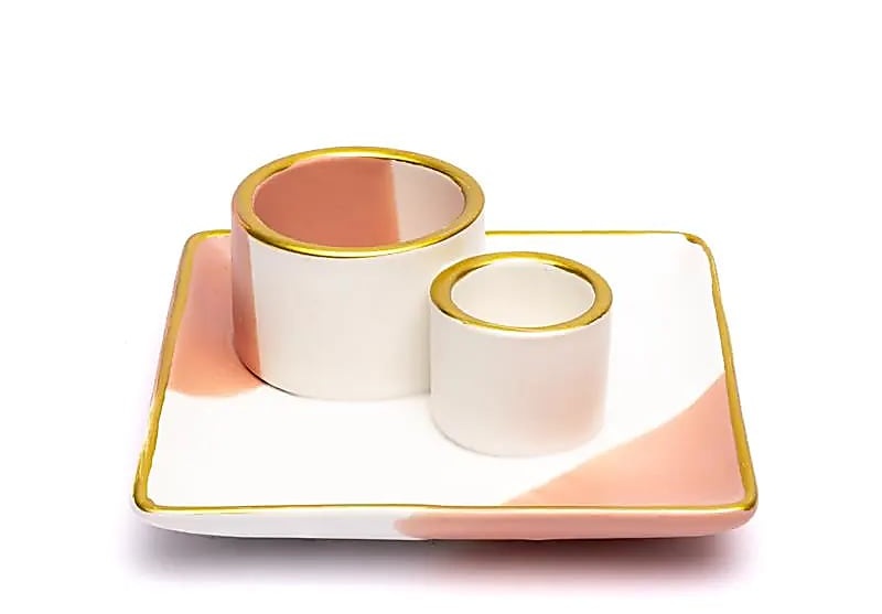 Een keramische brander in roze, wit en goud met een glad, glanzend oppervlak. De geïntegreerde schaal heeft een subtiel bloemaccent dat zorgt voor een zachte, decoratieve uitstraling, passend bij zowel interieur als spirituele beoefening. Geschikt voor smudgebundels en Palo Santo-stokjes.