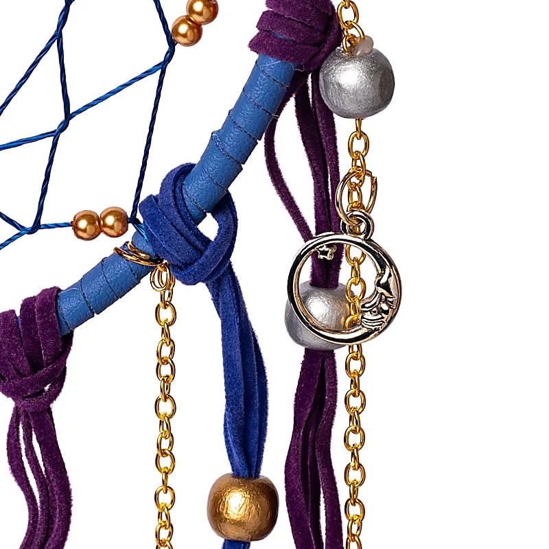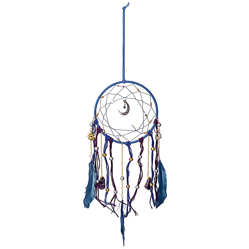 Volgens de traditie van de inheemse volken van Noord-Amerika is de nachtelijke lucht gevuld met dromen; goede én slechte. Een dromenvanger, opgehangen boven of nabij het bed en vrij bewegend in de lucht, zou deze dromen filteren. Goede dromen vinden hun weg door het web, glijden langs de zachte veren omlaag en bereiken de dromer. Slechte dromen raken verstrikt in de draden en verdwijnen bij het eerste licht van de ochtend. Afmeting: ø 16 x 50 cm. Deze uitvoering combineert decoratieve elementen zoals bedels in de vorm van zon en maan, amethist trommelstenen en schitterende goudkleurige kettinkjes. De maansikkel in het midden en de combinatie van blauwe en paarse tinten geven dit stuk een magische uitstraling. Versierd met getrommelde amethist, een steen die traditioneel wordt geassocieerd met spirituele helderheid, emotioneel evenwicht en een goede nachtrust. Let op Dit product is handgemaakt. De afwerking kan daarom enigszins variëren ten opzichte van de afbeelding.
