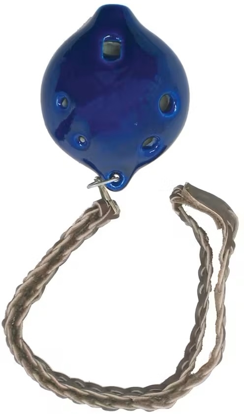 De blauw geglazuurde fluit is bijzonder makkelijk te bespelen voor kleine handen en daardoor geschikt voor vroeg muziekonderwijs. De ocarina kan om de nek gehangen worden.
