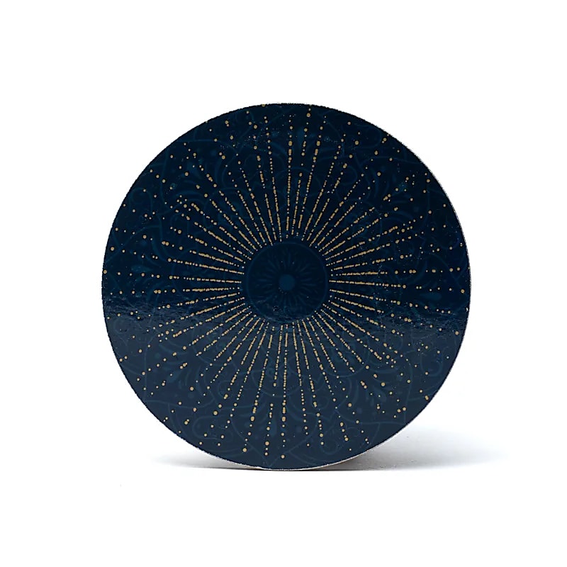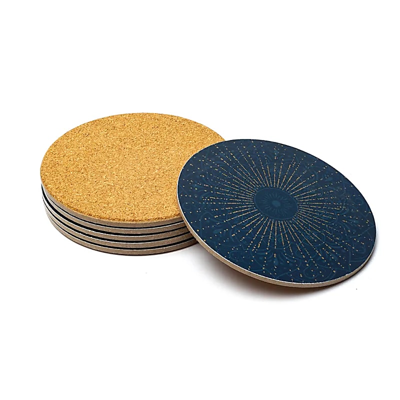 Set van 6 onderzetters met motief 'Mandala' (donkerblauw). Materiaal: MDF. Afmeting: 10 x 0,5 cm. Vanwege de drukmethode die wordt gebruikt voor deze onderzetters, kunnen minimale kleurverschillen voorkomen.